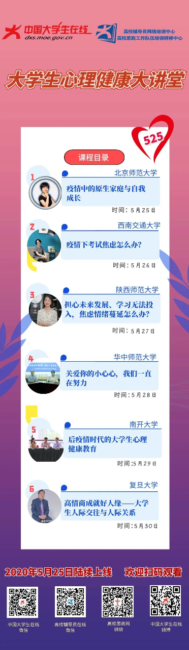 525大学生心理健康日期间,中国大学生在线、高校思政工作队伍培训研修中心(高等教育出版社)、高校辅导员网络培训中心联合北京师范大学、南开大学、复旦大学、华中师范大学、西南交通大学、陕西师范大学心理中心共同推出《大学生心理健康大讲堂》系列精品课程,帮助大学生在后疫情时期调整好心情,以积极的心态面对生活、学业与职业发展。欢迎广大师生届时观看!