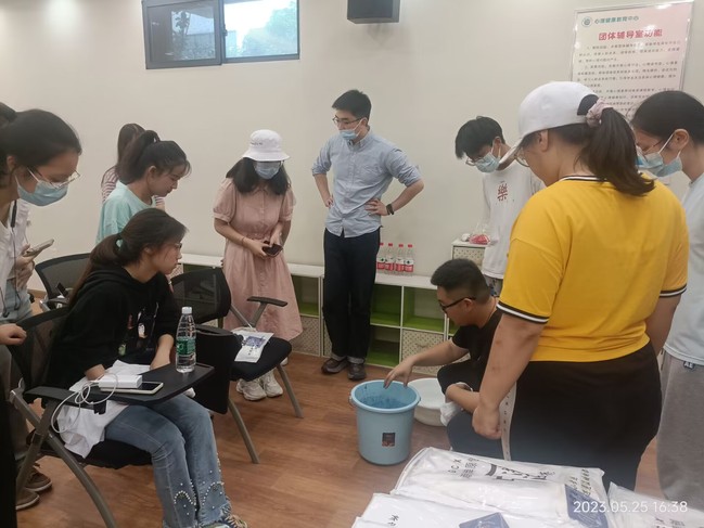 活动第三站,在思源楼110心理团体辅导教室,机电工程学院心理辅导员华崇志老师指导两校师生开展靛蓝染色T恤活动。“老师!手会不会变蓝呀?”“为什么刚染完是绿色然后就变蓝了?”……参与其中的部分青年学子充满了好奇,纷纷展示染色后的“蓝指甲”。手工劳动对于心理压力的缓解有重要作用,大家学会了染色技巧,丰富日常活动,体验到了劳动带来的快乐,领悟到了工匠精神的内涵。
