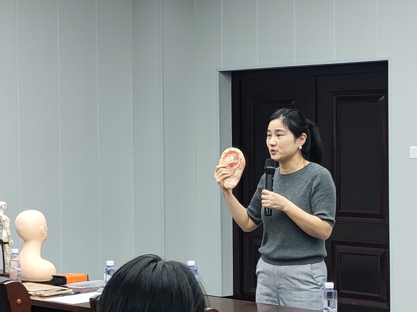 在中医适宜技术体验环节,武汉市第三医院光谷院区护士长陈松妍带来了别开生面的保健操,学生们在跟练中领悟中医智慧,现场互动热烈。