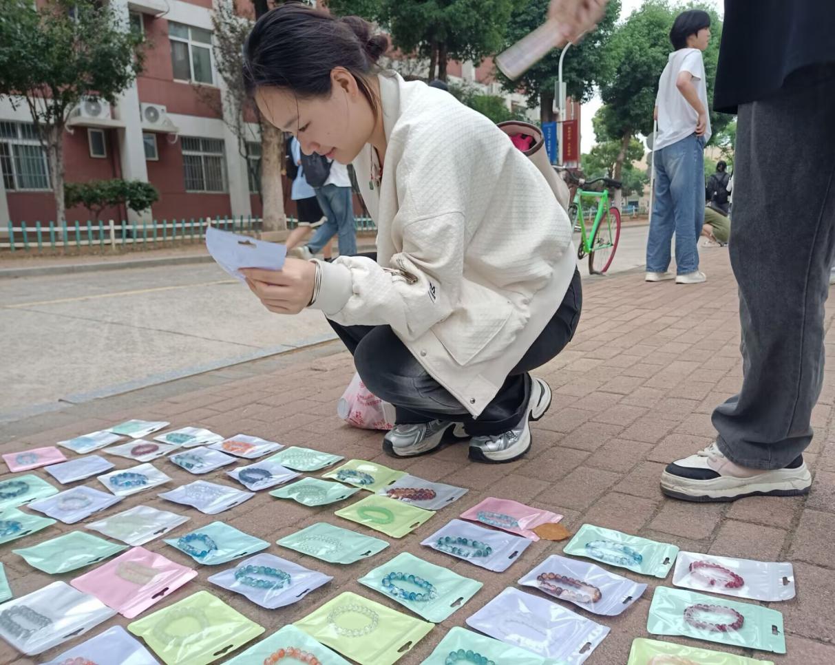 活动以“自由交易+心智挑战”双轨模式,打造沉浸式实践育人场景。在光谷东校区篮球场旁,8个创意摊位整齐陈列,精巧珠串折射匠心工艺,雅致花束传递艺术气息,“二次元周边”产品彰显青春活力,多元风格交织成校园市集独特风景线。